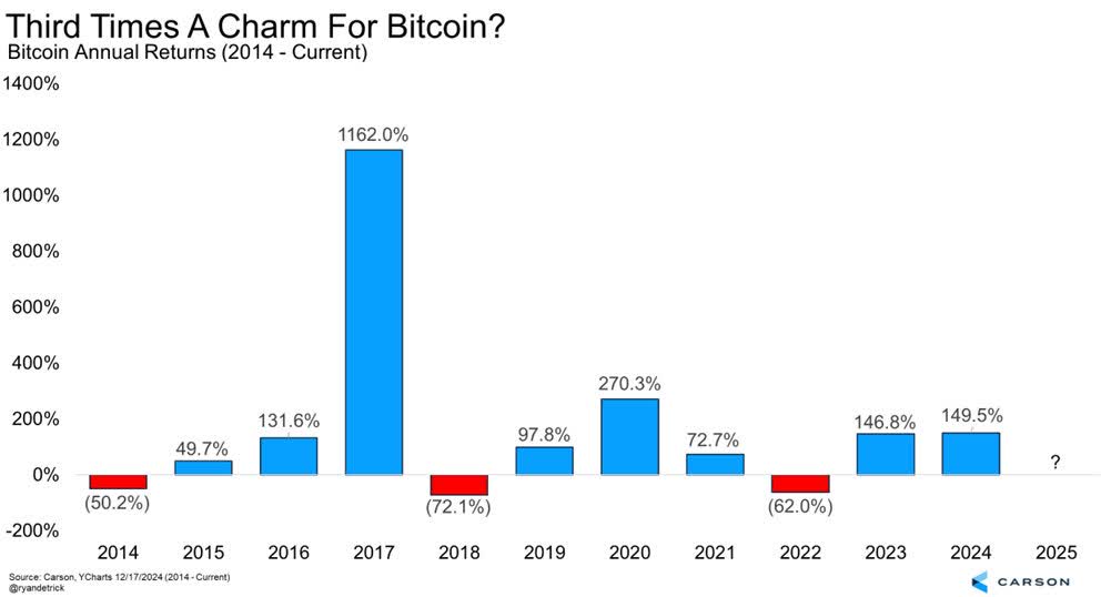 Bitcoin historically rallies every three years in a row, followed by a year down.