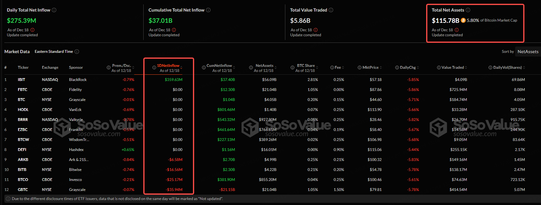 The Bitcoin spot ETF with the highest net inflow on Dec 18 was iShares Bitcoin Trust, with a net inflow of $359.63 million, according to SoSoValue.