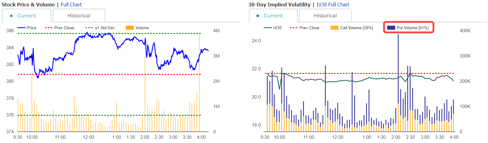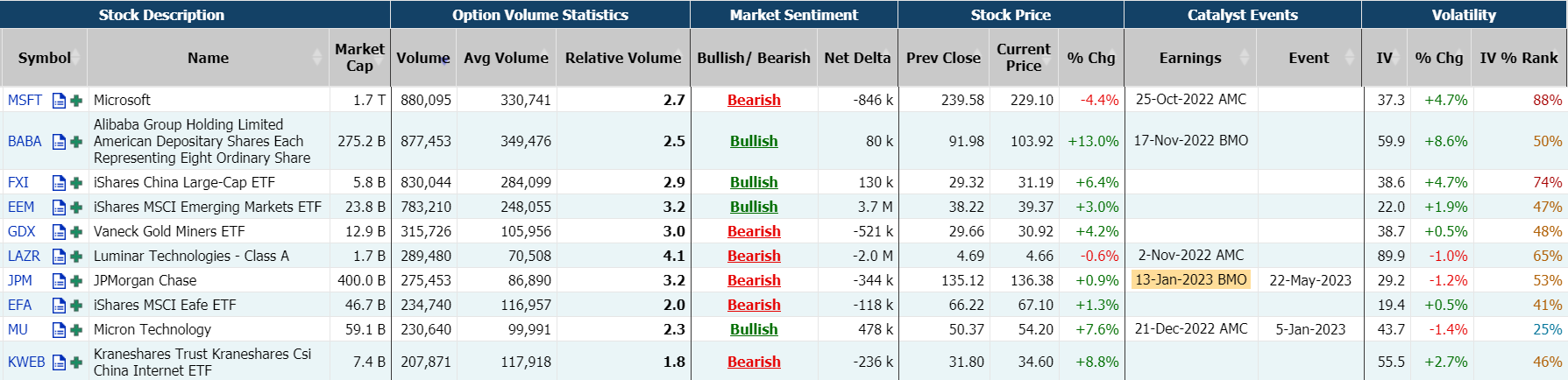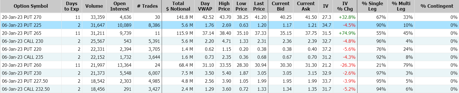 微软期权合约成交88.98万张,看涨期权占全部期权交易的40%。2023年1月6日到期行权价为225美元看跌期权的成交量特别高,成交量为31,647张。三、异动观察