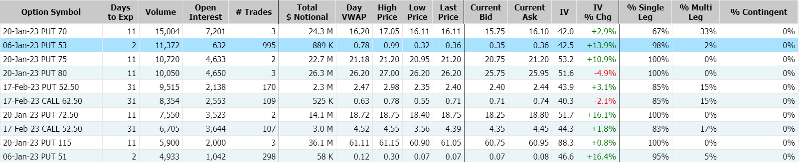 美光科技周三涨超7%,报54.20美元。2023年1月6日到期行权价为53美元看跌期权的成交量特别高,成交量为11,372张。
