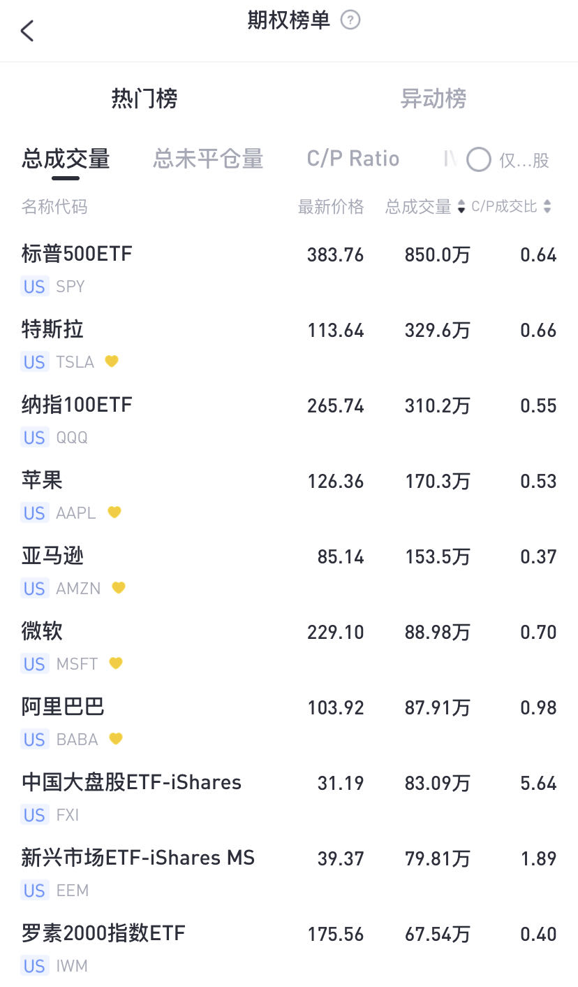 期权市场总成交量达44,020,181张合约,其中,看涨期权占比47%。标普指数ETF-SPY期权成交850万张合约,其中,看跌期权占比61%。