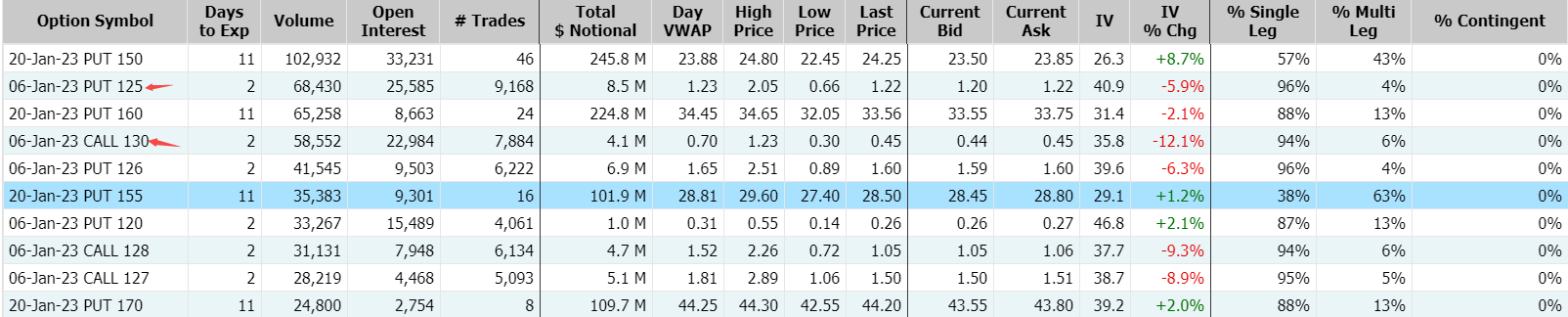 苹果周三上涨1%,报126.36美元。期权合约成交170.3万张,看涨期权占全部期权交易的34%。在2023年1月6日到期的期权中,多空双方发生了明显的分歧。
