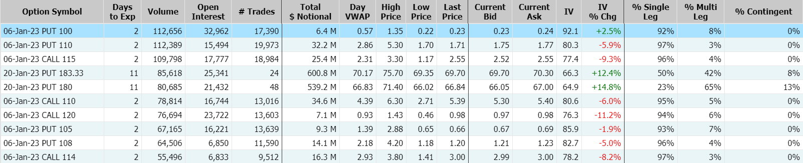 特斯拉周三涨超5%,报113.64美元。期权合约成交329.6万张,看涨期权占全部期权交易的40%。2023年1月6日到期行权价为100美元看跌期权的成交量特别高,成交量为112,656张。但是,2023年1月6日到期行权价为115美元看涨期权的成交量也同样特别高。这意味着在期权市场中,多空方发生了明显的分歧。