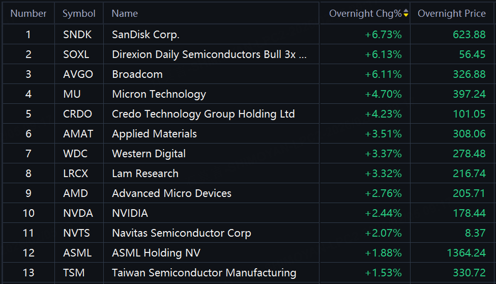 Chip, Storage shares rallied in overnight trading. SanDisk up 6.7%; SOXL, Broadcom up over 6%; Micron, Credo up over 4%; Applied Materials, Western Digital, Lam Research up over 3%.