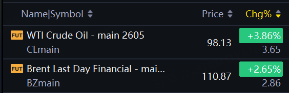 WTI crude oil futures rose 3.86% to $98.13 a barrel; Brent oil futures rose 2.65% to $110.87 a barrel.