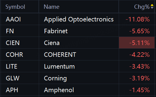 Optical communication stocks fell in morning trading. Applied Optoelectronics fell 11%; Fabrinet fell 6%; Ciena fell 5%; Coherent and Corning fell 3%; Amphenol fell 2%,