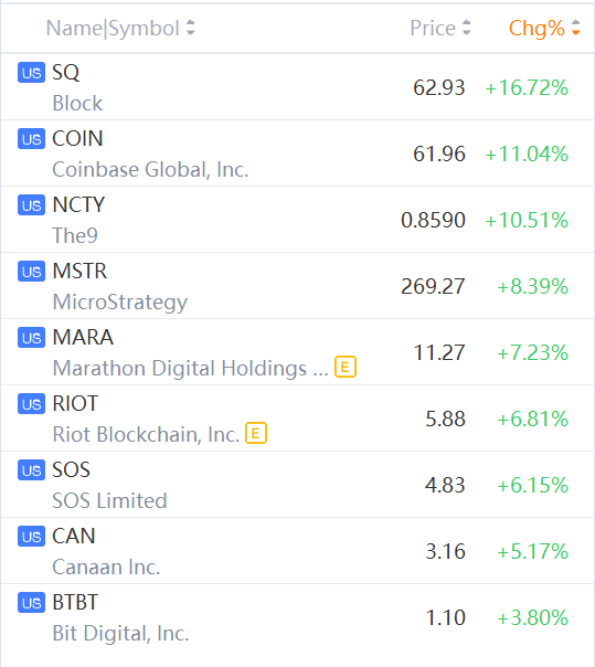Crypto stocks took off in morning trading. Block surged more than 16%; Coinbase soared over 11%.