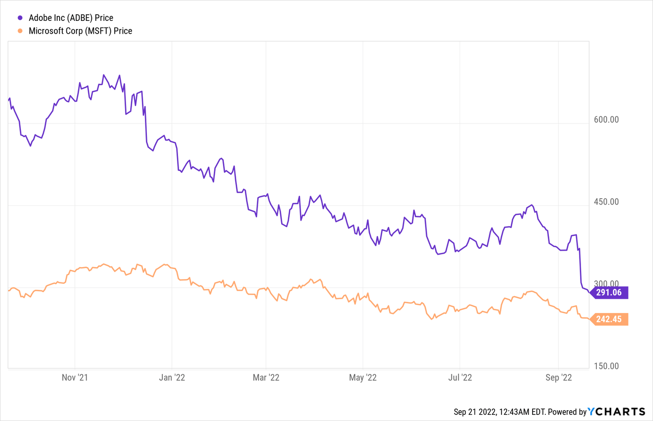 Then, for Adobe's Digital Media, Creative, and Document products to be so pervasive today at the point of being present on most designer's laptops, its partnership with the software giant must have been crucial. This deserves analysis, especially given that the stock has been battered by more than 55% in the last year to trade at less than $300. A comparison with Microsoft in the orange chart below reveals the extent of the damages but these started well before the Figma episode.