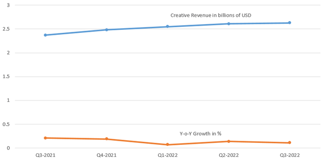 The acquisition was also done because of the increasing competition faced by Adobe XD, which is part of the Creative Cloud segment, and to this effect, the blue chart below shows how segmental revenues, despite showing progress, seem to have reached a peak. Thus, revenues grew to$2.63 billion in Q3-2022, representing an 11% year-over-year growth, but this is down from the 21% growth experienced in the third quarter of 2021 when revenues were$2.37 billion.