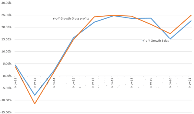 At the same time, deeper integration at the application level ensured less customization works for both Adobe and Microsoft resellers with fewer support hours in tackling customer support requests. As a result, not only Adobe's annual revenues(as measured on a year-on-year basis increased) but gross profits as well, since the end of 2015 as shown in the charts below. At this point, it can be argued whether Adobe's phenomenal progress was solely due to its partnership with Microsoft, but, one has to admit that there is indeed some coincidence.