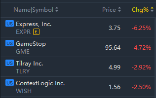 Meme stocks slid in morning trading, with Express falling over 6% and Gamestop falling nearly 5%.