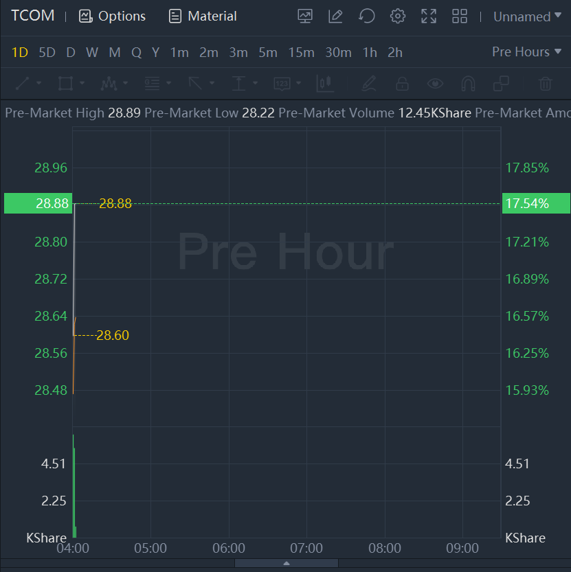 Trip.com shares surged 17% in premarket trading.China will halve to seven days its COVID-19 quarantine period for visitors from overseas, with a further three days spent at home, health authorities said on Tuesday.