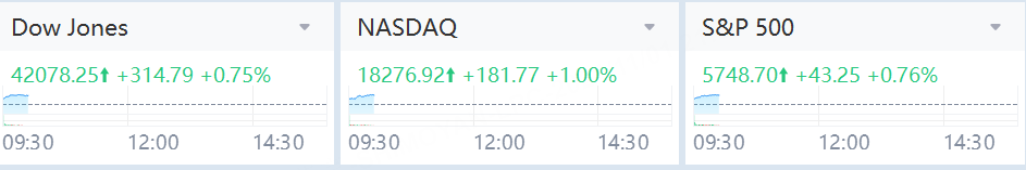 The Dow Jones Industrial Average gained 315 points, or 0.75%. The S&P 500 rose 0.76%; and the Nasdaq Composite rose 1%.