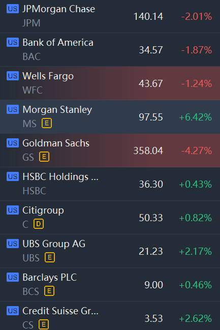 Bank shares were mixed in morning trading. Morgan Stanley jumped 6% while Goldman Sachs fell 4%, JPMorgan fell 2%, Bank of America and Wells Fargo fell 1%.