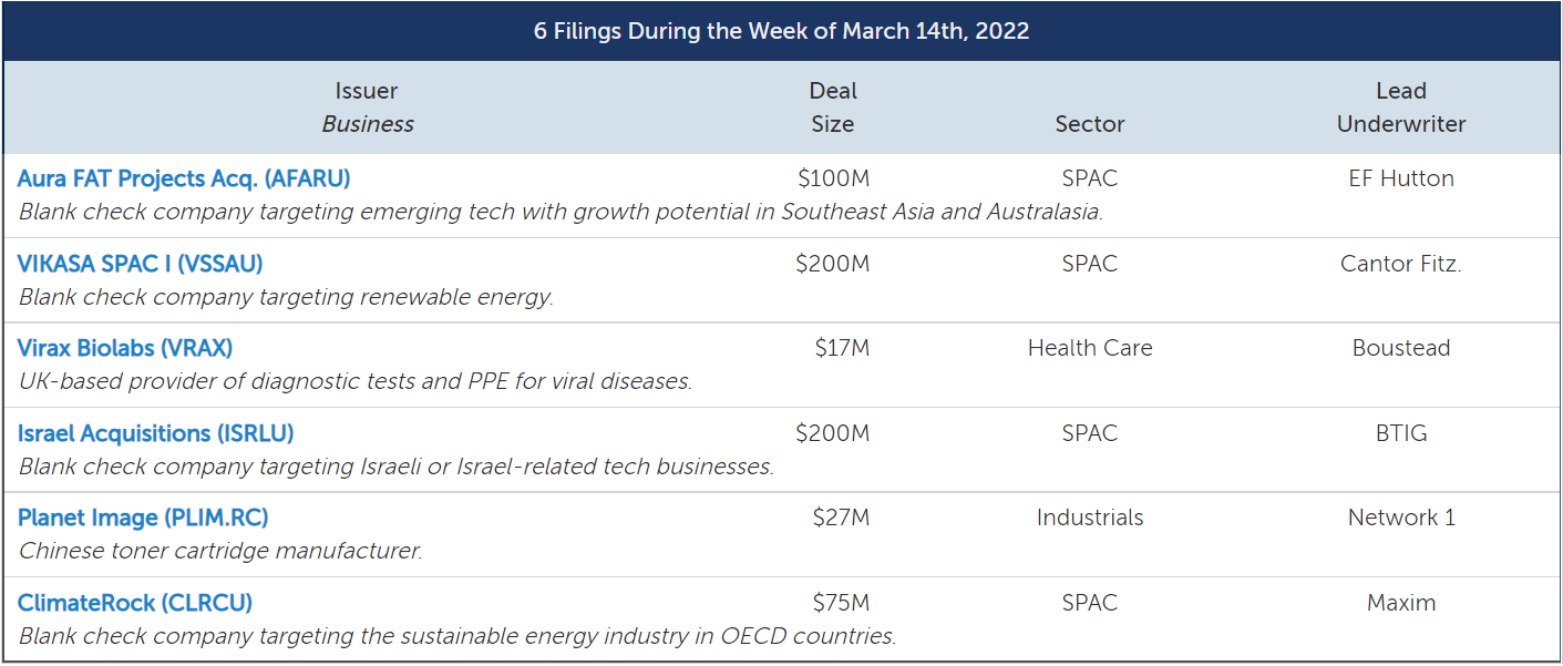 Four SPACs filed led by tech-focused Israel Acquisitions (ISRLU) and energy-focused VIKASA SPAC Series I Acquisition (VSSAU), which both filed to raise $200 million.