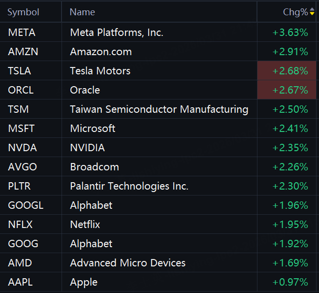 Big tech stocks rallied in morning trading. Meta rose 4%; Amazon, Oracle, and TSMC rose 3%; Microsoft, Nvidia, Palantir, Broadcom, Alphabet, and AMD rose 2%; Apple rose 1%.