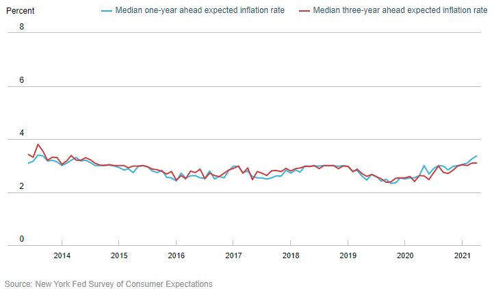 根据最新的消费者预期调查(Survey of Consumer expectations),4月美国家庭对未来一年的通胀预期从3月份的3.2%升至3.4%,创下2013年9月以来的最高水平。调查还显示,三年期的通胀预期中值为3.1%,与上月调查持平。