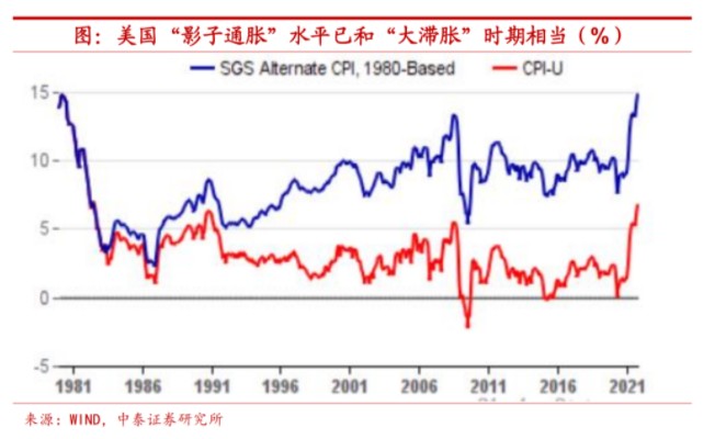 如果按照1980年的方法,重新计算当前的通胀水平,即所谓“影子通胀”,则会发现美国CPI同比增速已达到15%左右的高位。