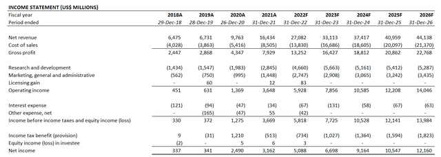 AMD’s upbeat performance and outlook continues to support the growth assumptions we had previously analyzed. Updating our forecast for the company’s actual first quarter results, with the addition of expectations pertaining to Xilinx-related sales, AMD is projected to grow its topline by 65% to $27.1 billion by the end of the current year. The year-on-year growth assumption slightly exceeds management’s guidance of +60% for the year, which we consider reasonable given seasonality demand that is expected to be bolstered by new product launches in the latter half, as well as AMD’s consistent track record of outperformance.