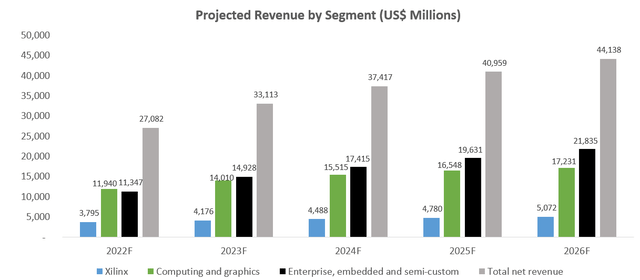 Based on management’s brief overview of Xilinx-related achievements to date and longer-term integration plans, we are expecting AMD to add $3.8 billion (inclusive of $559 million recognized in 1Q22) in Xilinx sales on top of organic AMD growth estimates. The forecast considers Xilinx’s performance trends in recent quarters, as well as management’s observations of growth in the low-20% range based on a full-year compare to CY/2021. And over the longer-term, our forecast estimates Xilinx sales to expand at a five-year compounded annual growth rate (“CAGR”) of 6% towards $5.1 billion by 2026. The growth assumption applied is consistent with current demand trends and opportunities observed in the global FGPA market, as well as longer-term synergies pertaining to AMD’s strategic leverage of Xilinx technologies on expanding its product portfolio for greater capitalization of market share.