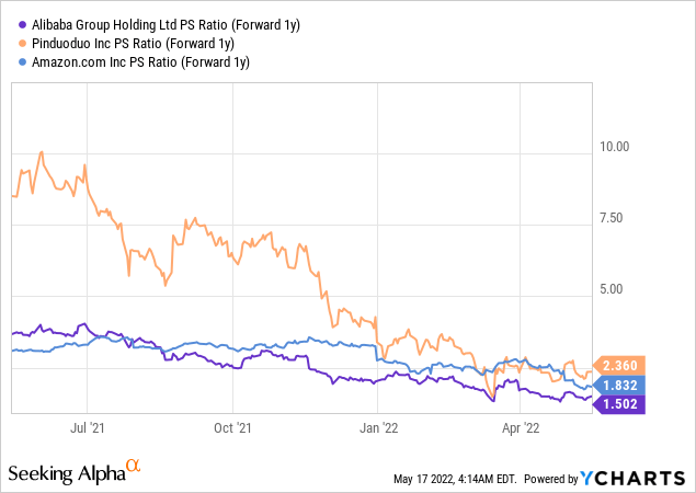 Alibaba is one of the most under-performing stocks in my portfolio, but I believe the market is currently not pricing Alibaba's e-commerce prospects rationally. Alibaba’s shares have started to trade at a truly pitiful valuation in 2022 which completely neglects Alibaba’s considerable free cash flow prowess and aggressive buybacks at discounted prices. Although Alibaba is seeing a slowdown in its top line growth, the company will continue to grow, especially in businesses that are meant to diversify its operations, namely cloud computing. Alibaba’s current P-S ratio has fallen to 1.5 X, which makes it one of the cheapest e-commerce empires in the market.