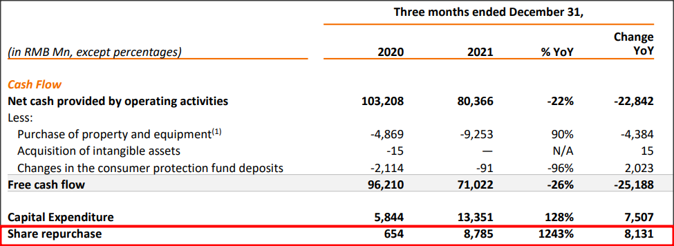 Alibaba’s free cash flow decreased 26% in the December quarter to 71.0B Chinese Yuan which calculates to $25.2B in the third quarter. The decrease was due to weaker operating cash flow related to a slowdown in Alibaba’s core e-commerce business as well as accelerating strategic investments in a variety of other businesses. My estimate for Q4’22 free cash flow is 20-25B Chinese Yuan which is the equivalent of $3.0-3.7B and I estimate that Alibaba could have purchased up to $2.0B of its shares in Q4’22.