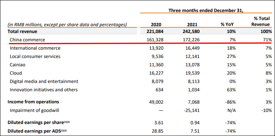 Because of lockdowns in other cities that were put in place after the end of the quarter, I can also see Alibaba submitting an outlook for FY 2023 that indicates an uptick in revenue growth. Large cities like Shanghai and Beijing went into lockdown in the second quarter which could provide an additional boost to Alibaba’s core e-Commerce operations. While Alibaba is diversifying its business and investing strategically into other businesses, like its cloud computing segment, the domestic e-commerce business in China still accounts for the majority of revenues, 71%, and this is not going to change in the short term.
