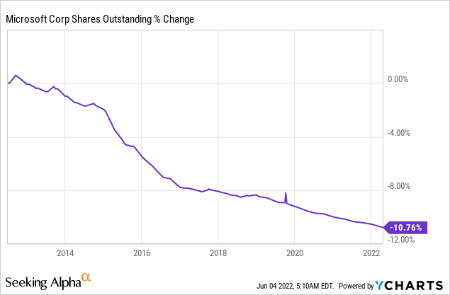 In Q3’22, the software company returned $12.4B to shareholders, $4.6B came as dividends and $7.8B came as stock buybacks. Microsoft is repurchasing shares consistently in the market and the decline in the firm's valuation this year makes stock buybacks even more attractive from a shareholder point of view. Microsoft has reduced the amount of shares outstanding by more than 10% in the last decade and the firm will likely repurchase more shares in 2023.
