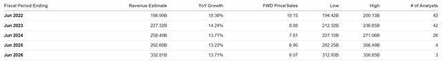 Due to Microsoft’s growth in the cloud segment, especially Azure, I estimate that the software company could generate between $70-75B in free cash flow next year. With a current market cap of $2.0T, Microsoft trades at a (forward) P-FCF ratio of 27-28 X and a P-E ratio of 25 X. Microsoft is also expected to grow its EPS at a higher rate (17.24%) this year than other large tech companies.