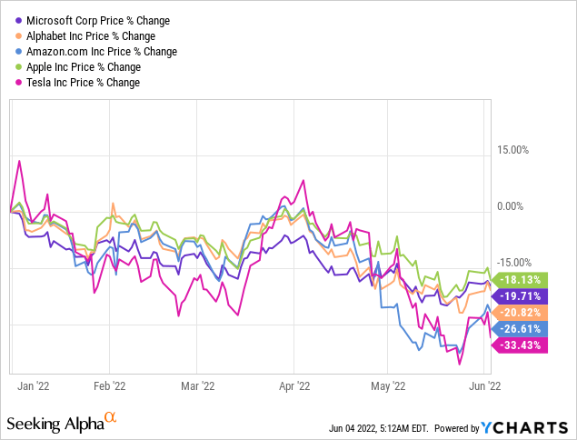 Microsoft went through a 20% drop in pricing in 2022 but did better than other high growth companies in the one-trillion-dollar club. Tesla currently has the largest year to date decline of 33%. Amazon is down 27% year to date and Alphabet's stock price has fallen 21%.