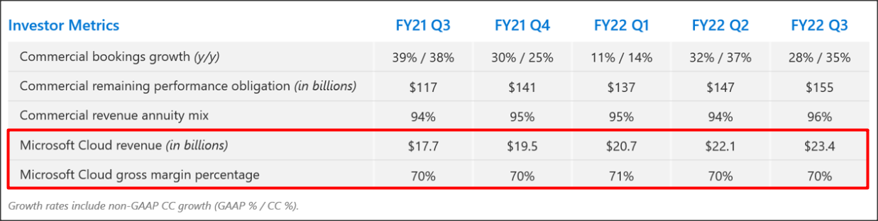 Microsoft's Intelligent Cloud generated 29% year over year growth to $19.1B in Q3’22, in constant currencies. Cloud is the largest revenue contributing segment for Microsoft with a revenue share of 39%, the fastest growing business for the software company and hugely profitable: it consistently generated gross margins of around 70% in the last year.