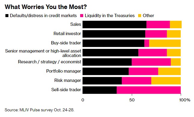 值得注意的是,有54%的受访者表示,随着借贷成本上升以及随之而来的经济低迷侵蚀企业利润,信贷市场的困境和违约率上升正成为投资者日益担心的问题。企业债务的压力超过了对美国国债流动性紧张的担忧,不过,在经历了一年的债券价格大幅下跌后,美国国债市场的流动性紧张已接近2020年危机的水平,引发了人们对市场运转的担忧。