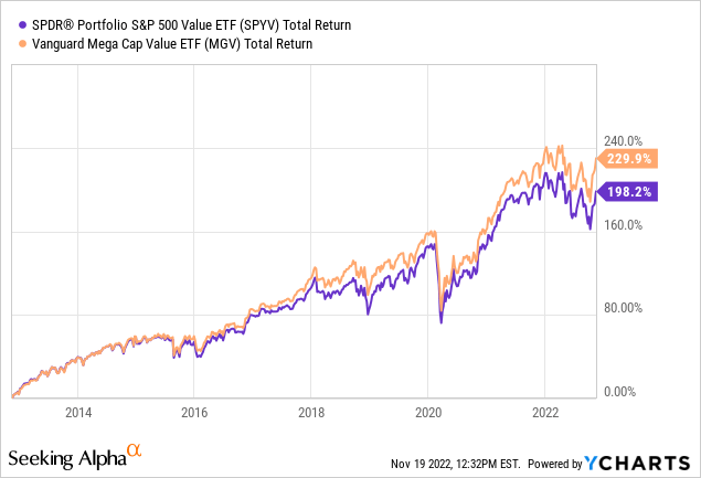 I'll end with a 10-year total returns comparison of the SPYV and MGV ETFs:
