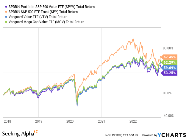 The following graphic compares the 5-year total returns of the SPYV ETF with that of the broad S&P 500 as represented by the SPY ETF as well as that of its value oriented peers: the Vanguard Value ETF (VTV), and the Vanguard Mega Cap Value ETF (MGV):