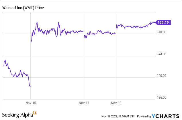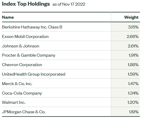 Two relatively defensive consumer staples companies - Coca-Cola (KO) and Walmart (WMT) - hold down the next two positions in SPYV's top-10 list and equate to a combined weight of 2.5%. Walmart popped ~$10 higher on Tuesday after delivering Q3 results that surprised analysts and were a big beat on both the top- and bottom-lines: