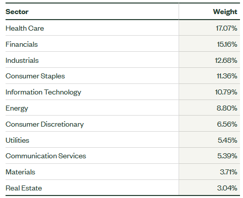 Lastly, and as expected, overall the SPYV ETF portfolio is overweight in the healthcare, consumer staples, financials, and energy sectors: