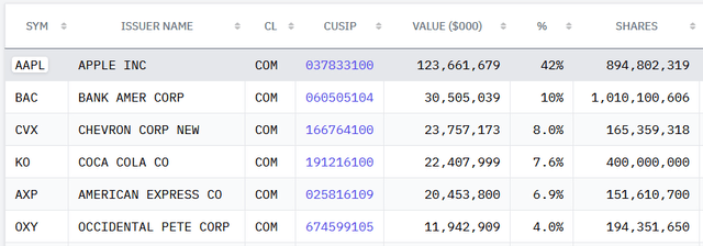 The #1 holding is the Warren Buffett headed diversified conglomerate Berkshire Hathaway (BRK.B) with a 3.2% weight. As I pointed out in my recent Seeking Alpha article on the (VOOV) ETF, Berkshire's latest SEC Form 13-F filing revealed the company's top-6 holdings (as of 9/30/2022) are as follows:
