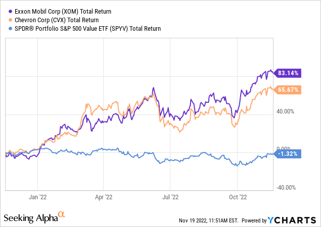 Exxon (XOM) is the #2 holding in the SPYV ETF, with a 2.7% weight. Exxon is performing much better for shareholders since Engine #1 won three board seats and strongly recommended Exxon restrain the over-spending that caused the company to post a negative shareholder over the "lost decade". As a result of its decreased cap-ex budget, and combined with relatively high oil &gas prices, Exxon has delivered record free-cash-flow this year and XOM stock (as well as Chevron) has responded quite dramatically to the upside, and has obviously been responsible for an out-sized portion of the SPYV's returns over the past year: