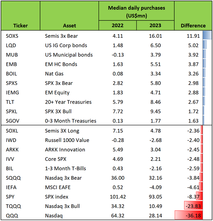 The table below shows ETFs are currently experiencing the biggest flow divergences since 2022. “The three bottom ETFs are the last two years’ more popular vehicles,” said analysts, while the biggest gainers, such as Direxion Daily Semiconductor 3X Bear, have a defensive tilt to them.