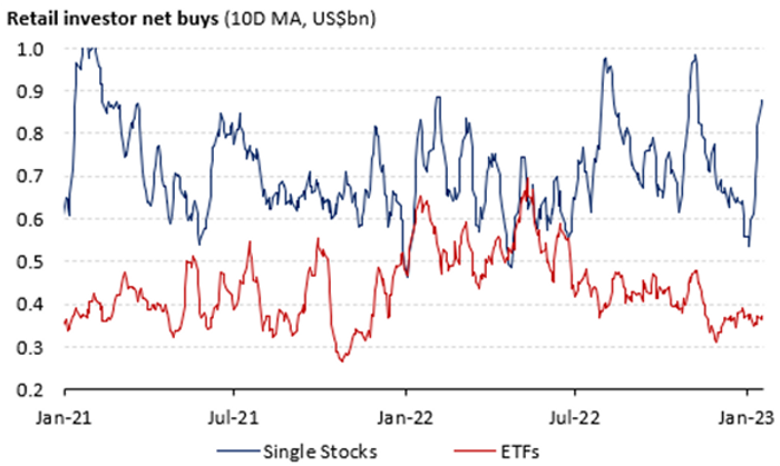 “We believe the January market rally is once again stemming from a bout of institutional investor short covering and rising equity demand from retail investors. However, despite the rebound in purchases, the aggregate retail flow has not yet recovered to previous highs, meaning that we’re still in a longer-term downward trajectory when it comes to retail participation,” wrote analysts led by Iachini, in a Thursday note.