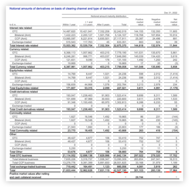上图是德银的2022年报。从表内来看,22年末德银衍生品合计本金高达42.5万亿欧元,远高于总资产规模,且其中利率合约本金占比超77%,在加息环境下市场普遍较为担心德银衍生品业务的违约风险和利率风险。但是,我们首先需要明确,财报中的数字是衍生品合同的名义金额,并非其风险敞口。