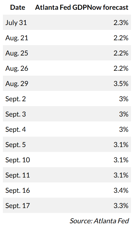 It isn’t just earnings forecasts. Expectations for third-quarter GDP growth have been climbing, too. According to the Atlanta Fed’s GDPNow model, U.S. economic output was expected to grow by 3.3% in the third quarter as of last week. That’s compared with 2.3% in late July.