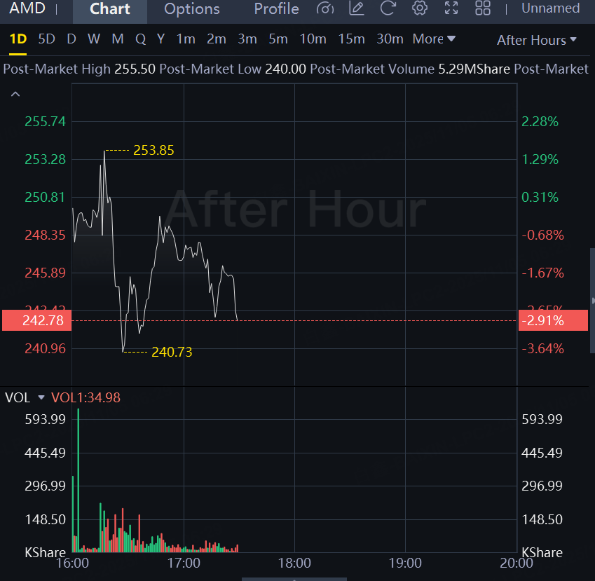 AMD's shares may be falling in extended trading because short-term traders could be taking profit, said Michael Schulman, chief investment officer at Running Point Capital. Investors are concerned about the overall economy and chip stock valuations that may take time to grow into, he said.