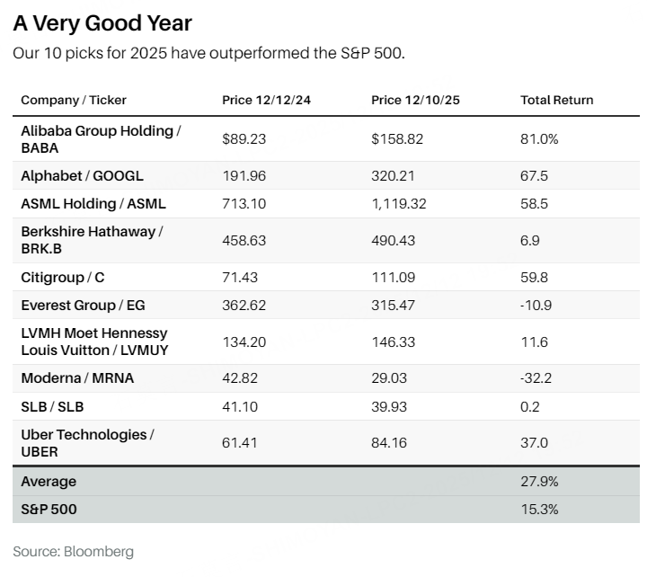 Investors have piled into a range of companies with exposure to artificial intelligence this year, helping spawn a boom in a range of speculative stocks in areas like robotics, nuclear power, and space. Barron's capitalized on the trends with Alibaba Group Holding, Alphabet, and ASML Holding, as well as other winners, including Citigroup and Uber Technologies, in our top 10 picks for 2025.