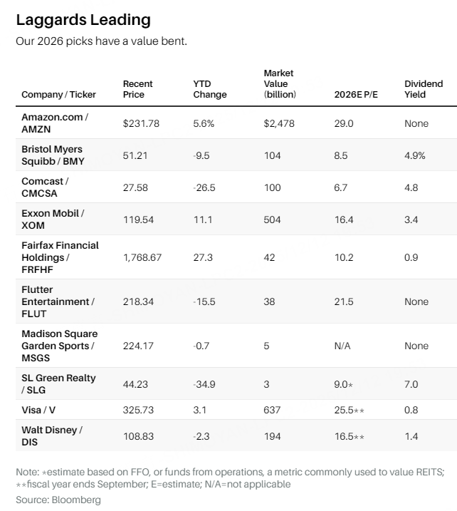 Barron's takes a value-oriented tack in our favorite stocks for 2026. Most of them trailed the S&P 500 in 2025 and are ready to play catch-up. Walt Disney and Exxon Mobil are industry leaders trading for around 16 times projected 2026 earnings, while Comcast is a better company than its price/earnings ratio of six suggests.