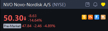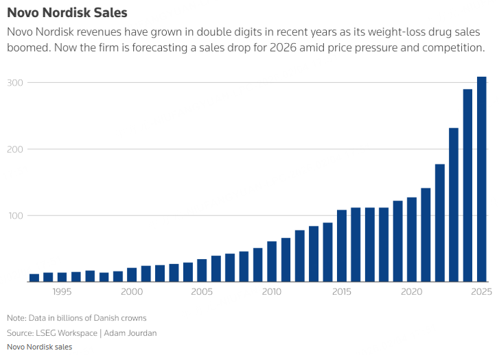 Novo-Nordisk A/S's shares plunged as much as 5% in premarket trading on Wednesday as the Danish obesity drug giant warned it would face "unprecedented" price pressures in 2026 after shocking the market with guidance for a sharp sales decline this year.