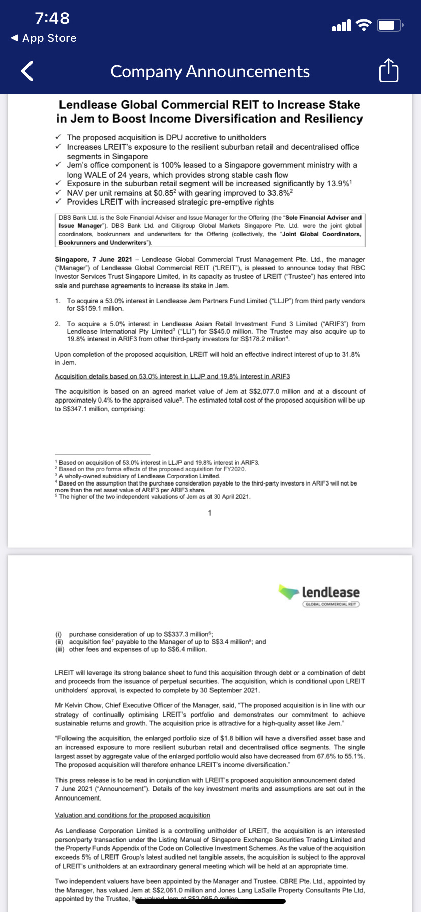 $Lendlease Global Commercial REIT(JYEU.SI)$Extract from sgx annoucmement 7 June 21. LREIT will leverage its strong balance sheet to fund this acquisition through debt or a combination of debt and proceeds from the issuance of perpetual securities. The acquisition, which is conditional upon LREIT unitholders’ approval, is expected to complete by 30 September 2021.