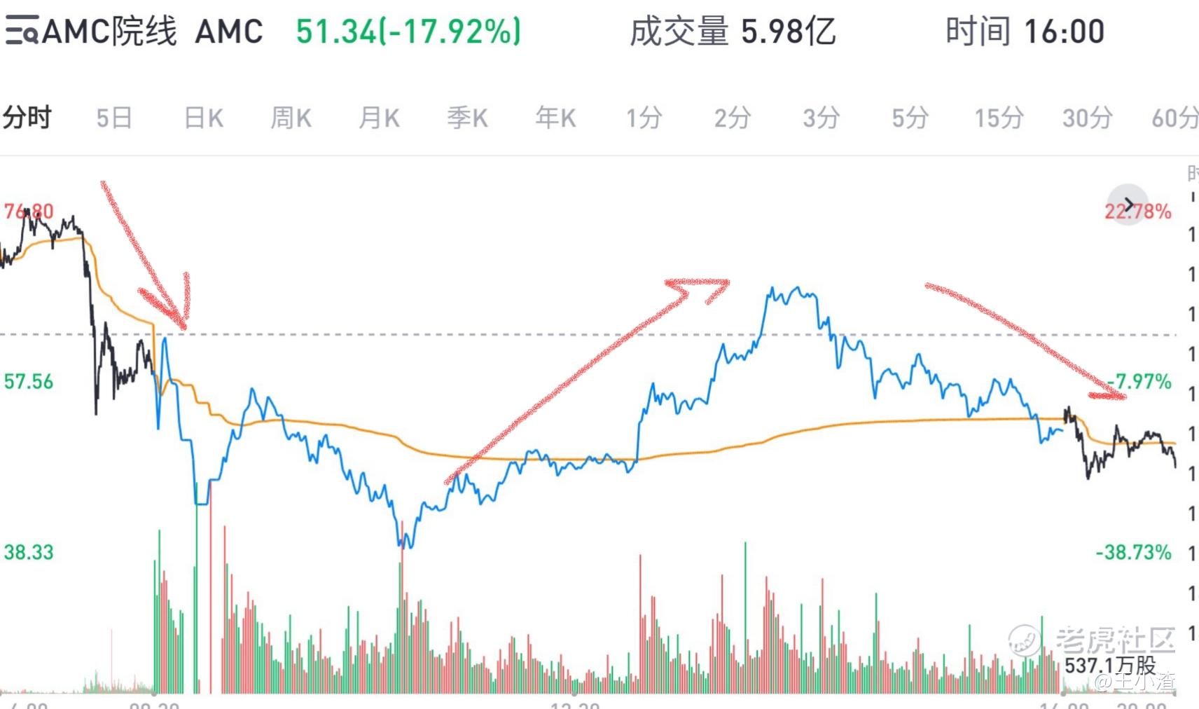 盤中大跌後,強勢反攻大漲一波,這波操作,會讓人覺得amc多頭不死,你看那反攻一波走勢很好,表現的完美無瑕,這會讓日內資金看到希望,amc王者歸來,這其實已經是主力資金在做局,撤退做最後準備,因爲後面還會有這樣的走勢,讓你覺得這是反攻大漲,實則誘你上釣