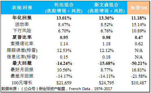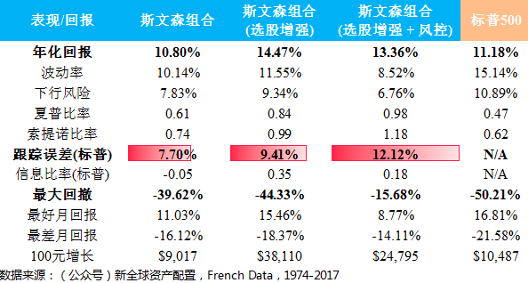 我們拿斯文森組合舉個栗子。 斯文森組合出自大師之手,在沒有做選股和風控之前,表現也不錯。隨着增加了選股和風控,模型的表現得到了進一步的提升,而且以標普爲對象的跟蹤誤差,也隨之升高。