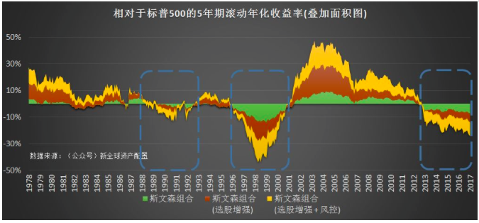 我們看到,斯文森組合(選股)和斯文森(選股+風控)總體的年化收益均明顯高於標普500,但是以5年爲週期的話,歷史上還是有明顯的3段時間沒有跑贏:1989-1993,1996-2001,2013-2017。越主動的資產配置,跟蹤誤差就越大,就越有可能在一定週期內跑不過單一資產。